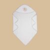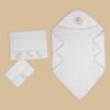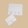 Il set è composto da un pratico e avvolgente accappatoio 75×75 cm con cappuccio ricamato e da una coppia di asciugamani (45×30 cm e 45×60 cm) arricchiti da fasce ricamate in millerighe di cotone 100% beige con stampa a stelline.