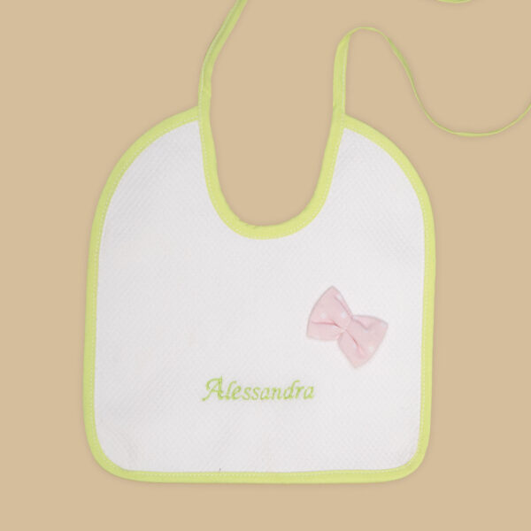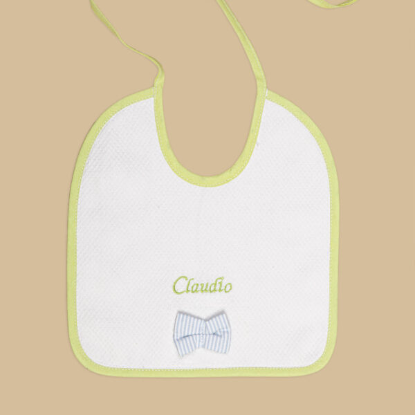 – 1 bavetta in piquet di cotone 100% (opzione maschietto o femminuccia) da personalizzare.