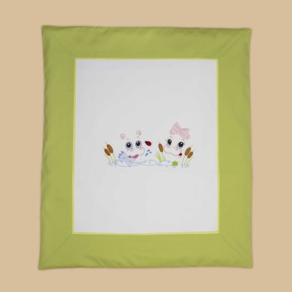 Set linea Zoo Ippopotami, realizzato interamente a mano, nei toni luminosi e vivaci del bianco e del verde mela che fanno da sfondo ai simpaticissimi ippopotami ricamati.