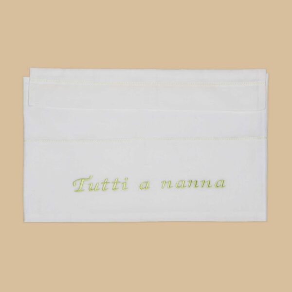 – set lenzuolino per carrozzino (federa 25×35 cm, lenzuolino 80×100 cm, lenzuolino coprimaterasso con angoli 40×75 cm) realizzato in batista di cotone bianco 100%;