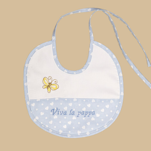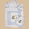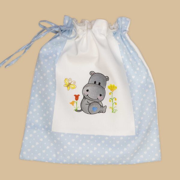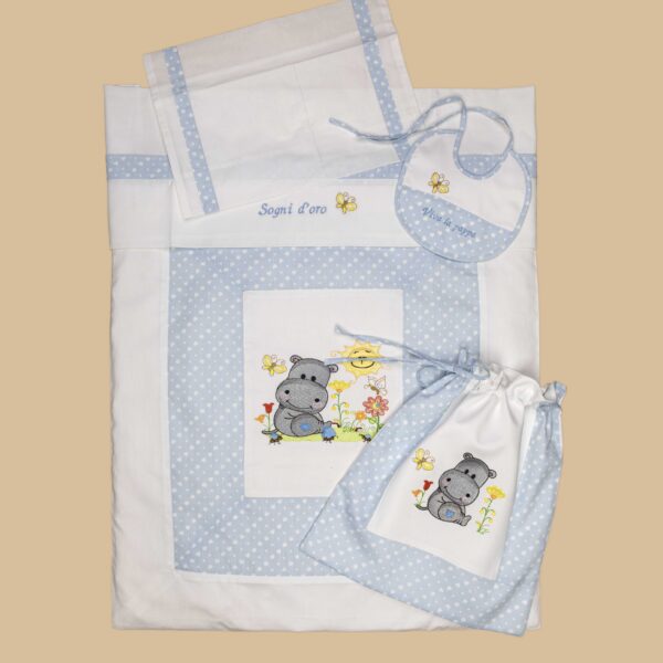 Set linea Ippopotamo, realizzato interamente a mano, che abbina il bianco al celeste con stampa a cuoricini.