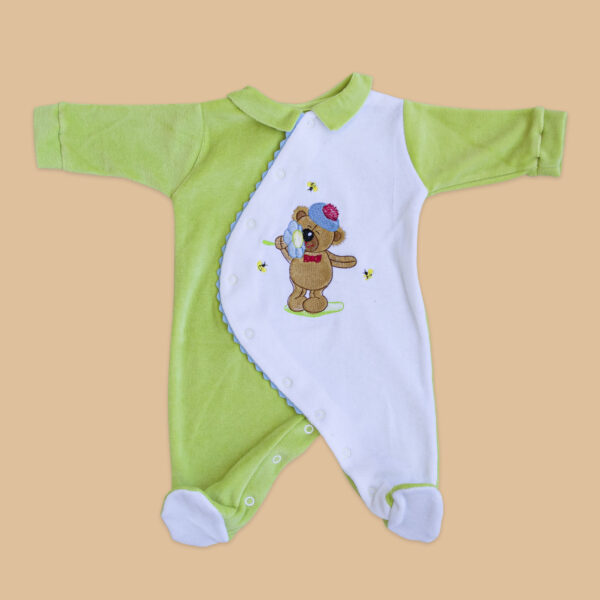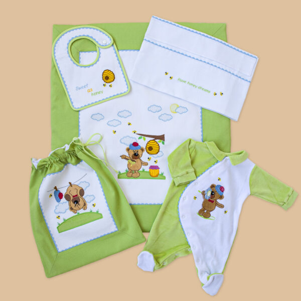 Set linea Orso Patch, realizzato interamente a mano, che abbina il bianco al verde mela.