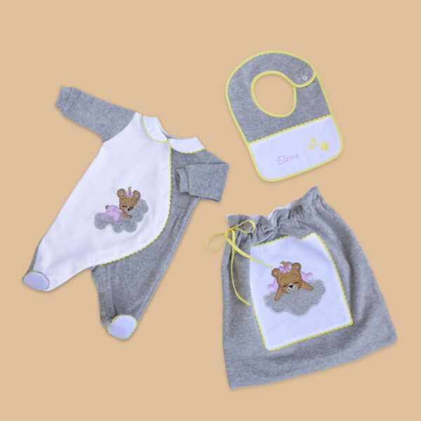 Mini set linea Orsetta Nuvola Ciniglia, realizzato interamente a mano, in millerighe di cotone bianco e in morbida e calda ciniglia grigia.