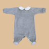 Tutina bimba realizzata interamente a mano in morbida e calda ciniglia con colletto e sottopiedini in millerighe di cotone bianco.