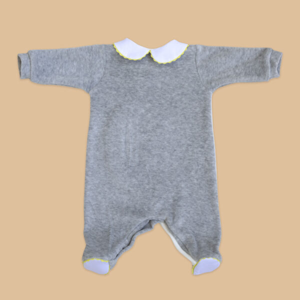 La passamaneria gialla a onde dona un tocco di luce e insieme al ricamo impreziosisce questa originale tutina, comoda e facile da indossare grazie ai pratici bottoni automatici sul davanti e sul cavallo.