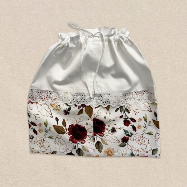 Sacca ricamata, realizzata a mano per il primo cambio della tua bambina. L’elegante ricamo floreale richiama le rose e i colori sgargianti del tessuto a fantasia in puro cotone.