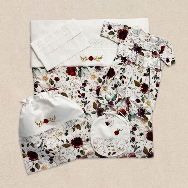 – set lenzuolino per carrozzino (federa 25×35 cm, lenzuolino 80×100 cm, lenzuolino coprimaterasso con angoli 40×75 cm) realizzato in batista di puro cotone bianco;