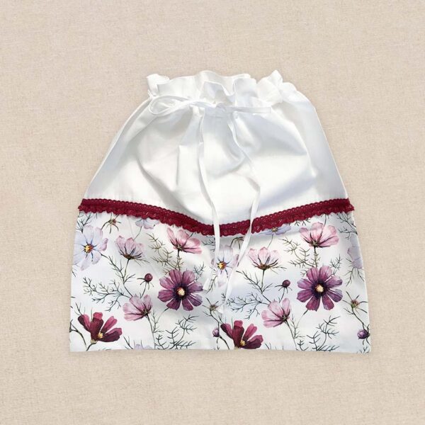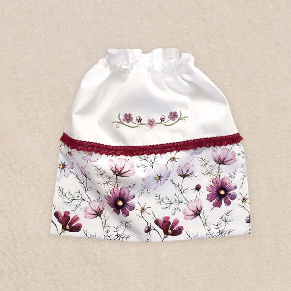 Sacca ricamata, realizzata a mano per il primo cambio della tua bambina. L’elegante ricamo floreale richiama le mille sfumature di rosa del tessuto a fantasia in puro cotone.