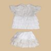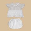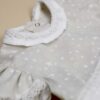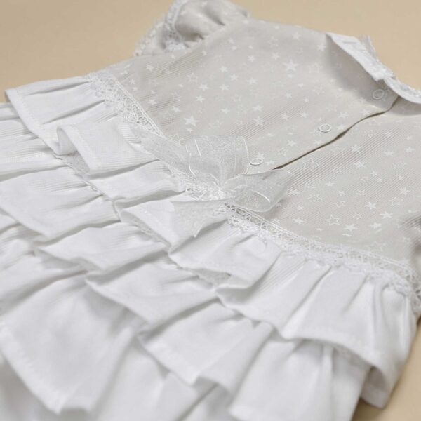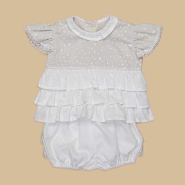 E’ composto da una casacchina in millerighe di cotone 100% beige con stampa a stelline bianche con balze e colletto in millerighe di cotone 100% bianco, e dalla culotte bianca abbinata con balze beige a stelline sul retro.