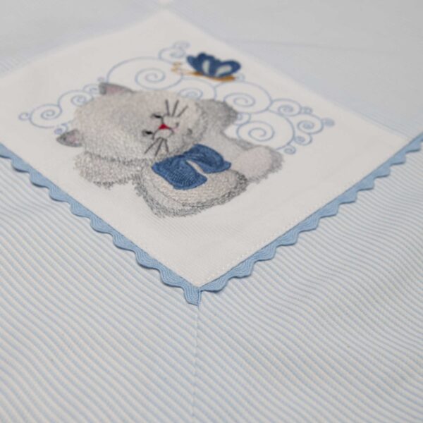 I graziosi gattini con i loro fiocchetti blu sono ricamati in 5 riquadri incorniciati da una passamaneria celeste a onde.