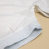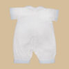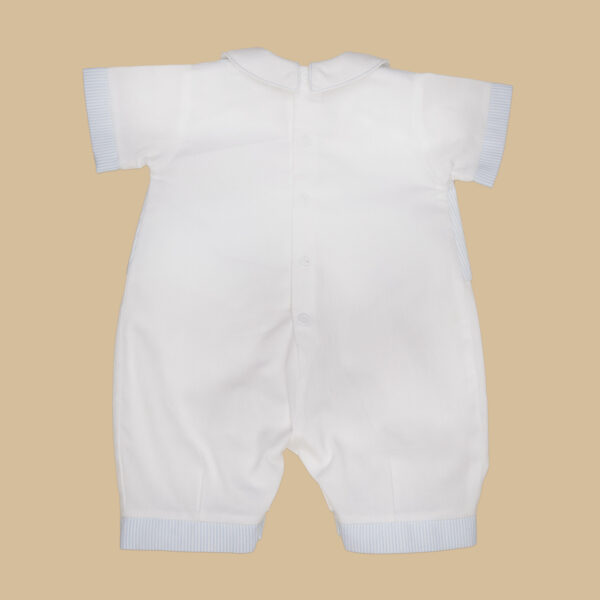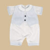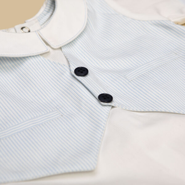 Pagliaccetto bimbo ralizzato interamente a mano in millerighe di cotone 100%, che abbiana il bianco al celeste della stampa a righe dei finti risvolti e del finto gilet impreziosito da due bottoncini blu.